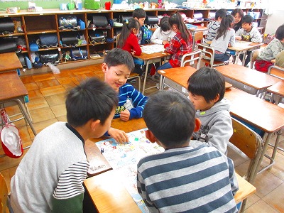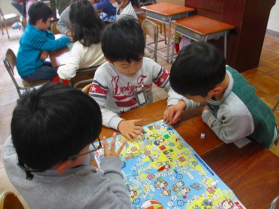 1年生が生活科の授業で「すごろく」を楽しんでいました。すごろくですので振ったさいころの目だけ進みますが、進んだ先に「3こもどる」や「6こすすむ」の言葉があり、喜んだり悲しんだりの連続でした。みんな夢中になってはしゃいでいました。