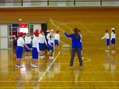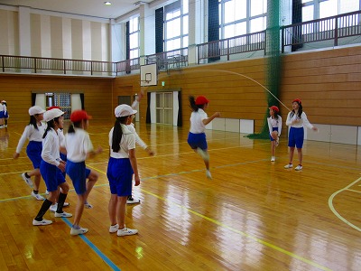5年生が2本のなわとびを使って、ダブルダッチに取り組んでいました。回す人が2本のなわを内側に交互に回します。2本のロープが回っているためジャンプからジャンプまでの間隔が短いので、入ったらつま先での小さなジャンプや駆け足のようなジャンプで連続して跳べるようにしていきましょう。