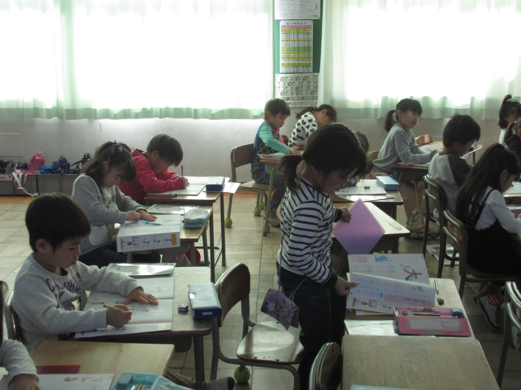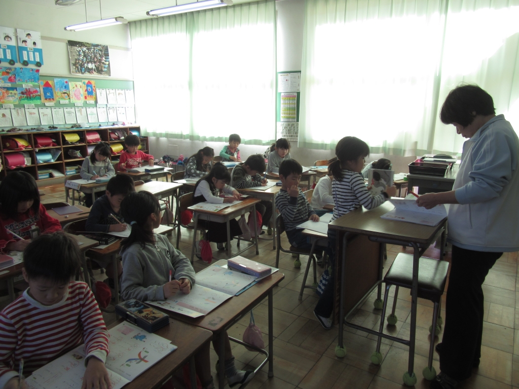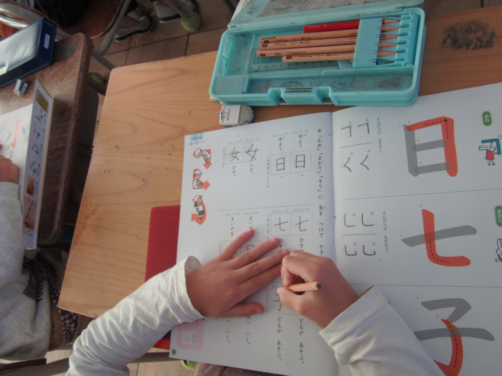 1年生が書写の学習をしていました。「とめ・はね・はらい」のある漢字をなぞり書きをしながらゆっくり丁寧に鉛筆で書き、学んでいました。