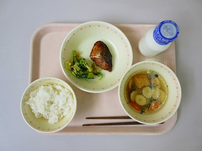 ご飯、牛乳、鯖の味勝漬、菊花和え、重陽の節句汁