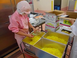 9月9日は重陽の節句です。それに伴って今日は重陽の節句献立にしました。「重陽の節句」は、別名「菊の節句」とも言われています。給食では食べることができる食用菊と白菜、いか、チンゲン菜を使って菊花和えを作りました。