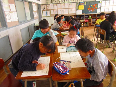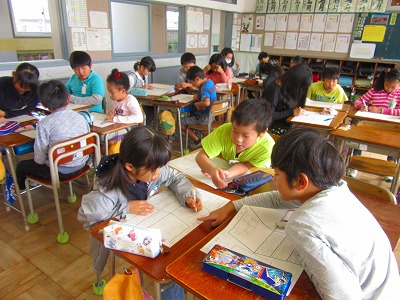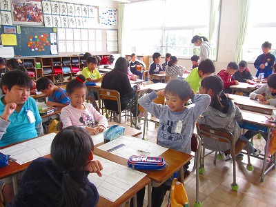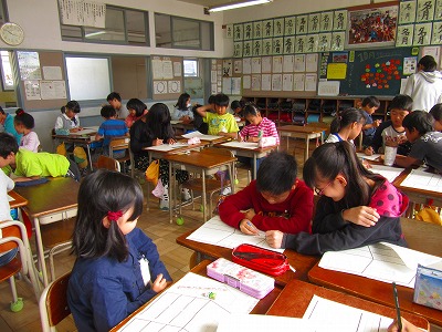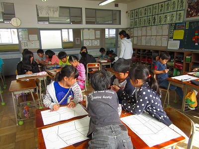 4年生が算数で面積を求める方法を、思考ツールのフィッシュボーンを使って考えていました。いろいろな求め方があり、工夫した求め方を考え説明しました。工夫を意識することで子どもたちの思考力の高まりを引き出します。