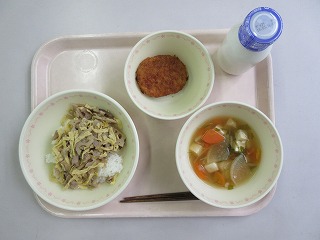 根気どんぶり、牛乳、愛知県産野菜コロッケ、すまし汁