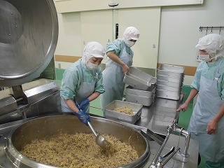 根気どんぶりは、れんこん(蓮根)をいれて根気をつけてもらおうと考えた献立です。れんこん、豚肉、こんにゃく、いんげん、短冊卵が入ります。しょうゆとざらめを使用して、甘辛く仕上げました。一味唐辛子を少し加えることで味が引き締まります。