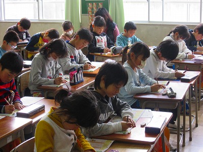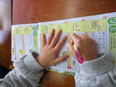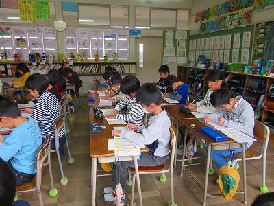 2年生が漢字ドリルを使って新しく習う漢字の学習をしていました。漢字の成り立ちや使い方、書き順を覚えながら、目と紙面の距離や姿勢に気を付けて、丁寧に漢字を書いていました。