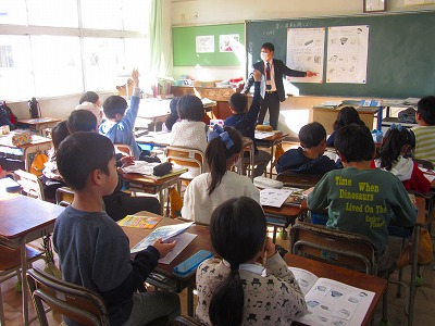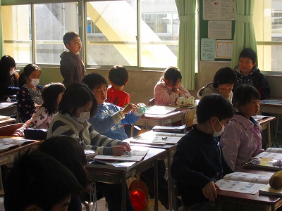 3年生が社会で昔の道具について教科書や資料を見ながら、おじいさんやおばあさんが子どもの頃に使った道具を調べました。道具の名前や何をするのに使うものか、みんながもっている知識を集めて学び合っていました。