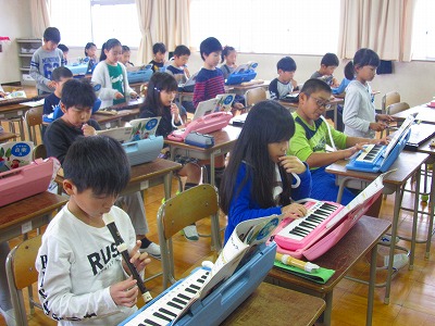 3年生が「ゆかいな木きん」を合奏していました。リズムの違いを感じながら、曲の流れに乗ってうまく演奏できました。