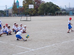 1年生のドッジボールはミニミニ版です。まだ、全員で行うには難しいようで、少ないグループで順番に練習をしている様子を見ました。ミニミニ版がとってもかわいくて、一生懸命ボールを投げたり、キャッチしたりする姿に1年生がぐんぐん成長しているなと感じました。