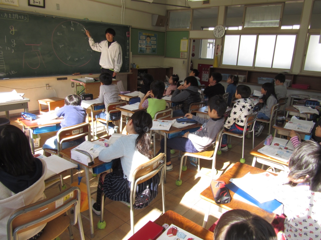 3年生が 算数で「g(グラム)」を使って重さを表すことができることを知り、はかりの大きい目盛りから順に1目盛りずつ読むことを学んでいました。