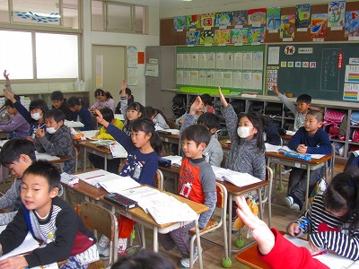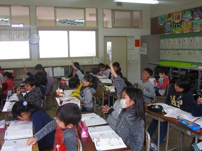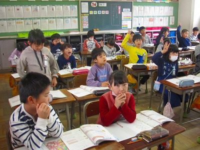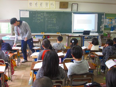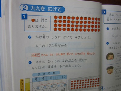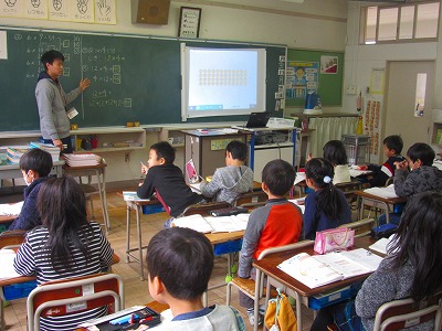 2年生が算数の学習で九九を使った文章題を解いていました。たし算でも求められる問題を、九九を使ってかけ算の立式をし、答えを出していきます。みんな集中して学習に取り組めていました。