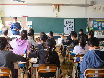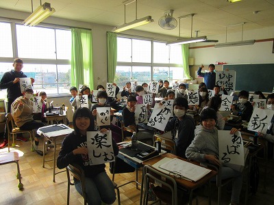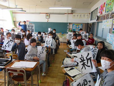 6年生が書写で中学校向けての気持ちを表す言葉を書きました。楷書ではなく少し形を崩して書くという課題が教師から出されました。みんな工夫して自分の思いを字に表していました。マシュー先生が特別参加していました。