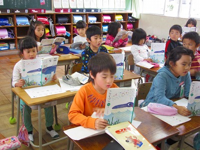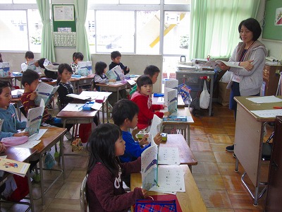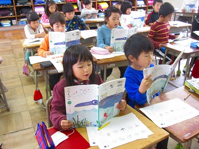 1年生が「かん字のはなし」を音読していました。グループで声を合わせて文章や段落を区切りとして、順々に次のグループへと回し読みをしていました。ゆっくりと丁寧に読むことをみんなで心がけ、声を合わせていました。