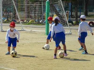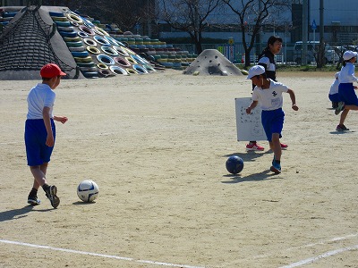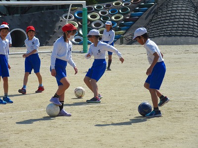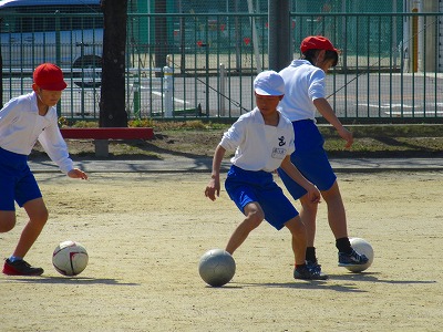 4年生が体育でサッカーに取り組んでいました。一人一人が足を使ってボールをキープしながら、相手のボールをエリア外へ蹴り出すゲームをしていました。相手との間にうまく自分の体を入れていました。