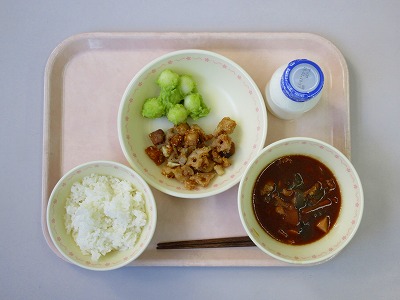 ご飯、牛乳、サメとれんこんの塩レモン風味、なめこの味噌汁、ずんだもち