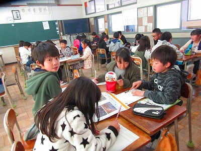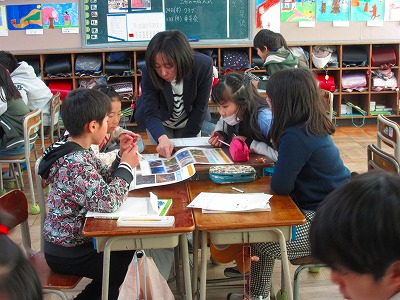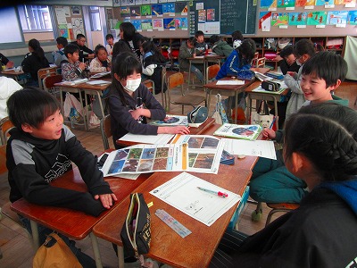 4年生が理科で教師から出された「寒くなった冬に、クワガタはどうしているのか」の課題に取り組んでいました。班には「クワガタがいる木の夏と冬の様子」と「あたたかいころと冬のほかの動物の様子」の写真資料が配られていました。班のみんなで知恵を集めて答えを出していきます。