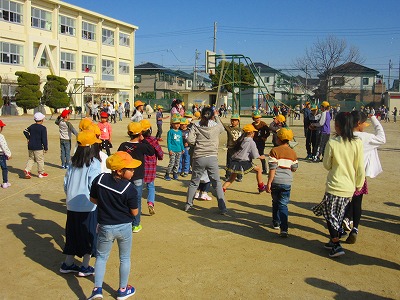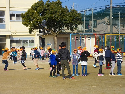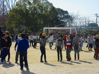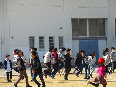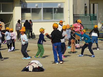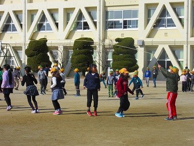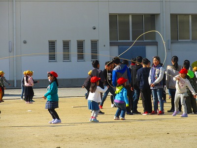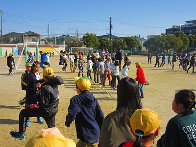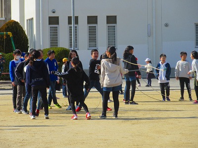 日が差し風もなく久しぶりに暖かな昼休みでした。運動場には大なわが元気いっぱい回っていました。どのクラスも金曜日の大なわとび集会での優勝めざして、とんでいました。