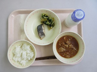 ご飯、牛乳、鰆の幽庵焼き、ほうれん草のお浸し、豚汁