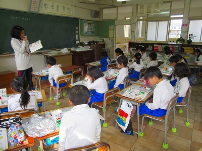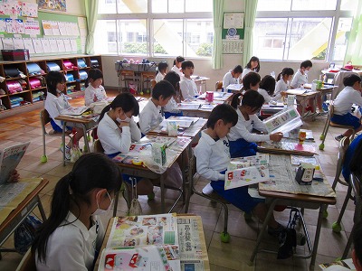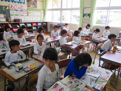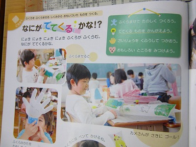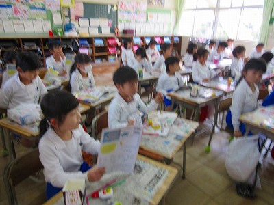 1年生が図画工作で、息を吹き込むとにょきにょき出てくるふくろを使って楽しい作品を作る学習をしていました。教科書にある参考例を見ながらイメージをふくらませていました。