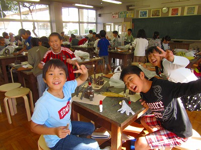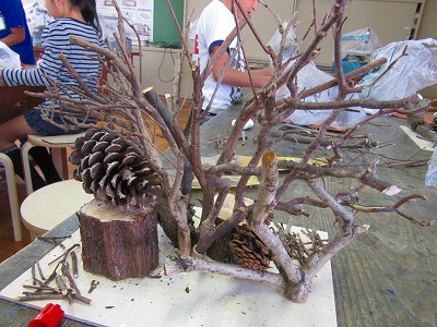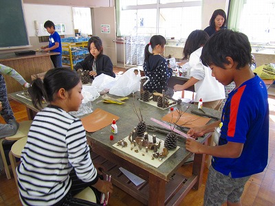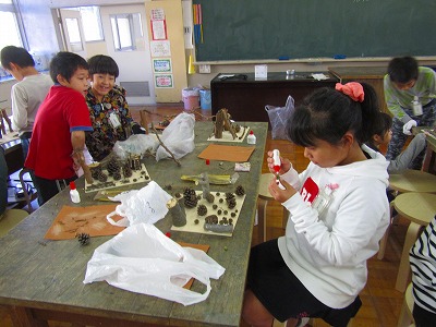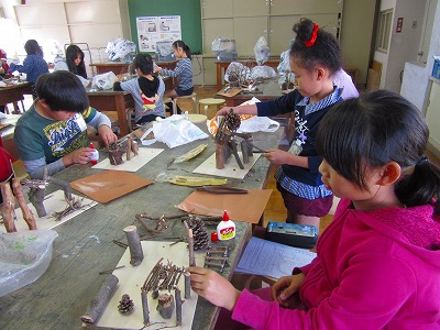 4年生が図画工作で「森のげいじゅつ家」の作品を完成に近づけていました。底板の上にのこぎりで切った枝や拾ってきたドングリや松ぼっくりを立体的に組み合わせて取り付け、アイデア豊かなすみかを作っていました。