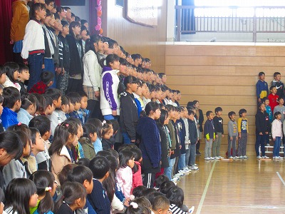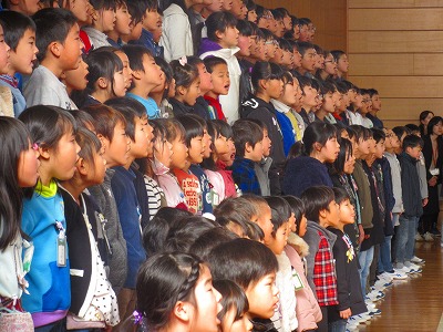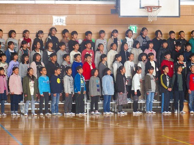 授業公開の後に全校合唱を発表しました。6月10日(日)の親子ふれあい学級で発表して約半年、日ごろの練習の成果を御家族の皆さんに披露しました。子どもたちは、全校合唱に取り組むことで、互いの気持ちと歌声を響かせ合い、心を一つにすることの素晴らしさを体感しました。