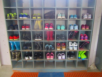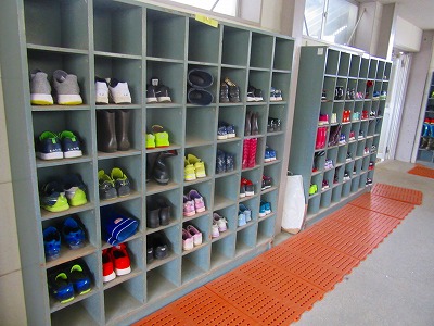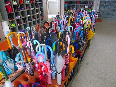 雨の日の登校でしたので、傘や長靴が下駄箱に並びました。入りにくい長靴が、うまく下駄箱に入れられていました。傘もきれいに傘立てに並んでいました。