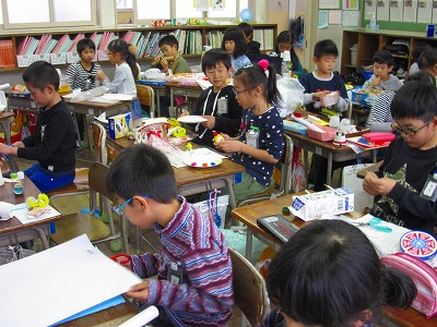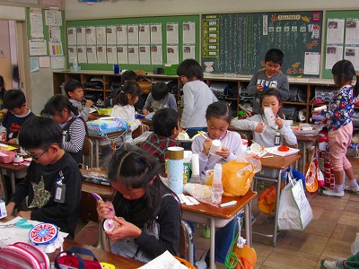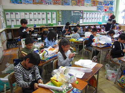 2年生が生活科でいろいろなおもちゃづくりをしていました。家から様々な材料を持って来て、楽しく遊べるおもちゃを工夫して作っていました。