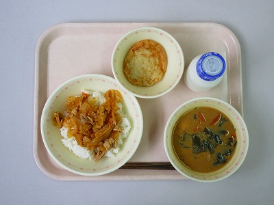キムタク丼、牛乳、はんぺんの和風ソースかけ、豆乳味噌汁