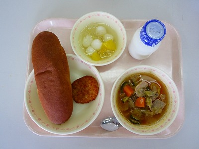 黒ロールパン、牛乳、夏野菜のポトフ、枝豆コロッケ、白玉入りマスカットゼリーポンチ
