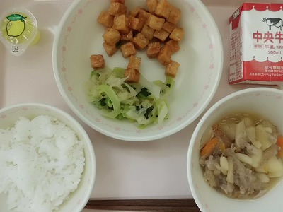 ごはん 牛乳 厚揚げの甘辛ソース 肉じゃが 即席漬け