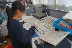1年3組の算数は100までの数のすごろく遊びをしていました。ペアになって、さいころを振り、出た目の数だけ進むのですが、時には1回休みのところがあったり、全然進まなかったりと、大変盛り上がりながら100までの数を学んでいました。教科書にありますので、ぜひご家庭でもご家族で楽しんでみてはいかがでしょうか?1年生もあともう少しで2年生ですね。心身ともに成長しています。