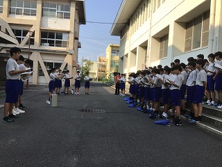 体育館にて全校朝礼を行いました。校長からは、海部地区中総体において、どの部活動も礼儀正しく、すばらいし姿が見られたことについてお話がありました。また、夏休みを迎えるにあたり、生徒それぞれが達成可能な目標にむけて取り組むこと、熱中症や水難・交通事故等に注意して過ごしてほしいとお話がありました。その後、中総体を含め表彰では、優秀な成績をおさめた部活動がそれぞれ順に登壇し、上位大会に向けての意気込みなども交えて発表する形で行われました。