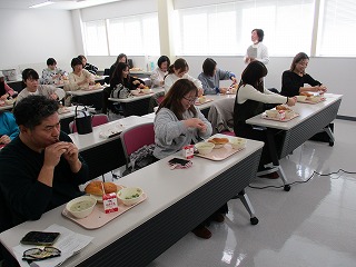 調理の様子を見学した後の試食会では、出来立ての給食を美味しくいただきました。
