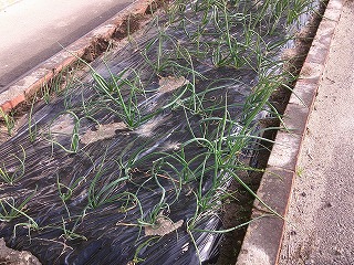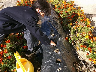 今回のタマネギの植え付けは、以前HPでも紹介した「タマネギ植穴あけ器具」を使って、2年生1名、1年生3名で約250本の苗を植え付けました。例年だと穴あけマルチを使いますが、普通のマルチに「タマネギ植穴あけ器具」の両端を2人で持って、穴を開けて、タマネギの苗を差し込むだけです。利点としては植えてから土を寄せるなどの作業がないので、短時間で植え付けることができます。また、穴が小さいので草が生えにくので除草作業も短時間でできます。畝立て前の土起こしのときに「タマネギ一発肥料」を施肥しているので追肥の必要もありません。生徒からは「植え付け作業は簡単だった」という感想も聞かれました。