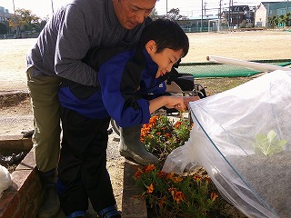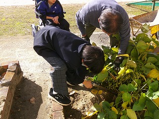 1年生二人でナバナの植え付けと丹波黒豆の収穫作業を行いました。二人とも野菜作りの作業は初めてでしたが、意欲的に取り組みました。車椅子のY君も苗を植えることや不織布を洗濯ばさみで留める作業は、体を支えてもらって行うことができました。丹波黒豆の収穫は茎をのこぎりで切断するので、M君が一人でやってくれました。