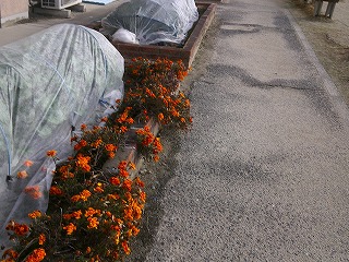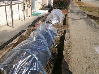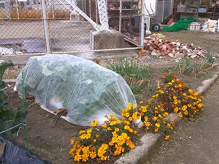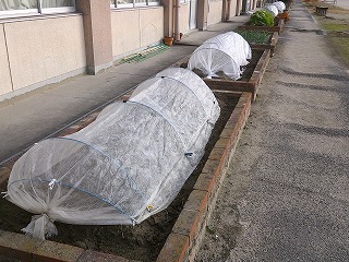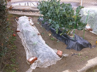 サニーレタスも春ダイコンもトンネルをしますが、サニーレタスは不織布、春ダイコンは穴が開いていないビニールを被せます。