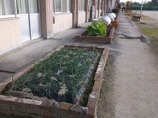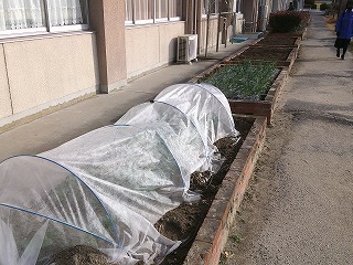 自立・作業の授業では年間を通して野菜作りの体験をしているので、菜園には年中何かしらの野菜が栽培されています。現在はサヤエンドウ・ステイックブロッコリー・ナバナ・ワケギ・ネギ・ホウレンソウ・キャベツ・ハクサイ・コマツナ・タマネギが栽培されています。今年から植え付け方法を変えたタマネギも順調に育ち、雑草もほとんど生えていません。年明けには、空いている菜園には春ダイコンの種まき・サニーレタスの植え付けをする予定です。