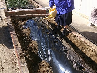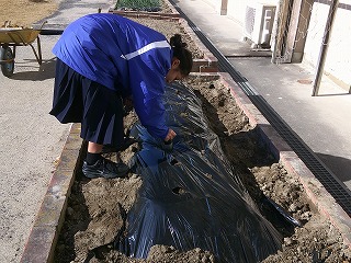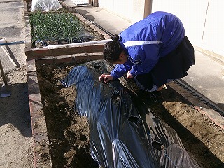 種から育てた苗がちょうど植え付ける大きさに育ったので、1年生4名で植付け作業を行いました。1年生は今までの自立。作業の授業ではマリーゴールドの種まき、タマネギの植付け作業の経験しかありません。今回は畝立てから不織布のトンネル設置までの一連の作業を経験しました。畝立ては両側から鍬で土を盛り上げます。交代しながら畝を立てました。1回目よりも2回目は立ち位置も鍬の動かし方も上手くなりました。やはり経験することが大事ですね。畝にマルチを張りますが、初めにマルチの種類や効果を説明した後、マルチを張りました。苗を7株植えるので「植え穴開け器」で各自が穴を開けて、苗を植え付けました。最後に防虫・防寒の為の不織布でトンネルをして終わりました。