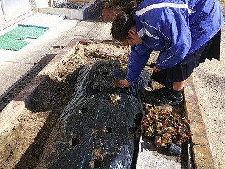 欠席者があったので女子生徒一人で作業をすることになりました。強風と寒い中での作業でしたが、一生懸命に取り組みました。過去にキャベツの植え付け作業を経験しているので、段取りよく作業を進めることができました。