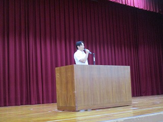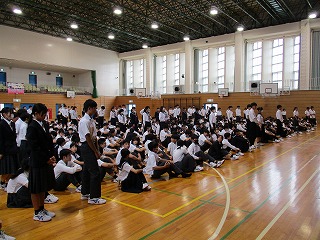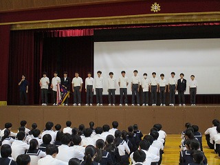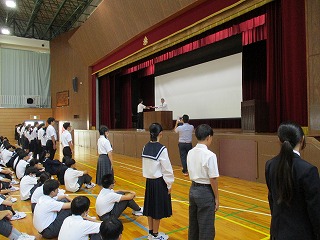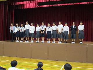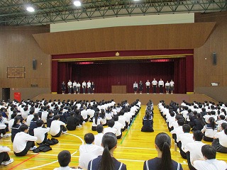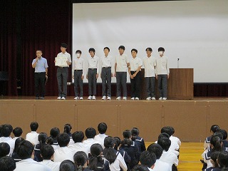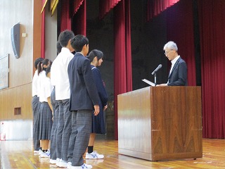 後期がスタートして初めての全校朝礼を行いました。後期生徒会役員認証の後、新旧生徒会長によるあいさつがありました。その後