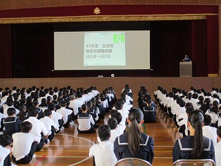 その後、部活動の伝達表彰が行われ、保健指導部から10/28~10/31に実施される無告知避難訓練についての話がありました。