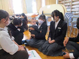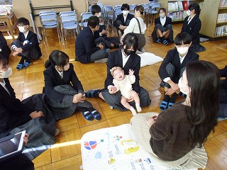 11月26日(水)と28日(金)の2日間、愛西市の保健事業の取組として、いのちの授業を実施しました。養護教諭から生命誕生についてのお話を聞いたり、妊婦体験をしたり、赤ちゃんとふれあったりしました。