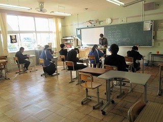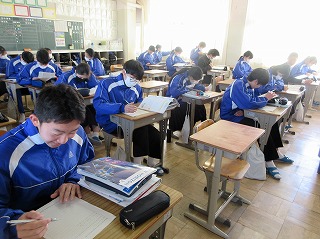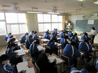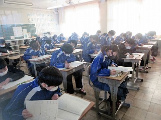 本日は、公立高校の「推薦・特色選抜」が実施されており、3年生の受験生が入試に出掛けました。3年生の教室では、再来週の「一般選抜」に向けて学習に励む姿が見られました。