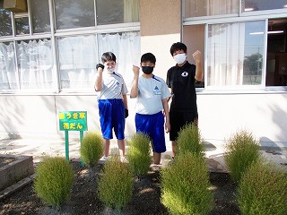 4月に花壇に何を植えるか相談して、ひまわりとほうき草に決めました。長雨の影響で育ちが悪く、特にひまわりは、30本以上あった苗が3本しか育ちませんでした。今は大きくなった花を楽しんでいます。(太田)ひまわりとほうき草を育てるのに草を抜くのが大変でした。ほうき草の手触りがサラサラで色が変わるのが楽しみです。(2年 町田)花壇の看板を2個も作ったので、大変でした。ひまわりの花が咲いてうれしかったです。(1年 髙橋)