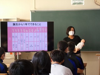 昨日と本日、愛西市の保健師さんのご協力のもと、2年生が「いのちの授業」を受けました。赤ちゃんがお母さんのおなかの中で、どのように成長していくのかを、ICT機器を使って学習し、生まれたての赤ちゃんはどれくらいの大きさで、どうやって抱っこするのか等を本当の赤ちゃんのような人形を使って実習しました。その後、9ヶ月の赤ちゃんとお母さんと、ZOOMを使ってつながり、いろいろな質問をしました。生徒の柔らかい表情がとても印象的でした。