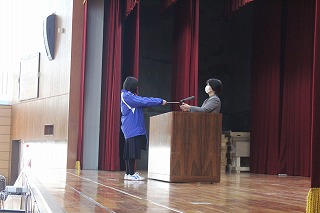 また、次年度、前期の生徒会認証式も行いました。「自分たちだけでは何もできないかもしれんせんが、皆さんの力も借りて、よりよい学校づくりを行いたい」という強い思いも伝えられました。生徒会の皆さん、よろしくお願いします。