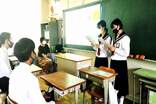 月曜日、帰りのST後、自治活動の時間に2年企画委員会が行われ、生徒会から「文化祭のテーマ案のアイデアを考えてもらいたい」と依頼がありました。2年生の岩田さんが生徒会代表として「SDGs」についてプレゼンを行いました。企画委員は、各学級の精鋭たちが集まる集団で、生徒会執行部の話も真剣に聞いていました。きっと、素晴らしいアイデアが出ることを期待しています。(2年通信「ミライ」)