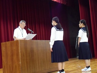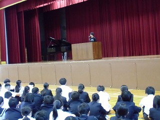 体育館にて全校朝礼を行いました。「歯の健康優良生徒」の表彰を行った後、校長からは、世の中の情報を積極的に知ろうとすることの大切さの話がありました。また、野外活動や修学旅行において多くの発見や学びをしてきてほしいとの話がありました。