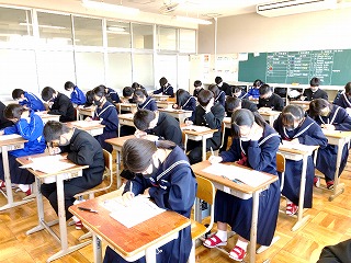 新しいクラスになって、緊張感があるなか、4月8日(木)9日(金)の2日間で学力テストが行われました。今回のテストは成績に関わるものではないですが、3年生ではこういった実力テストが1年のうちに何回か行われます。2年生までは実力テストが行われると「実力テストは実力で受けるものだから勉強はしない」と豪語する強者が必ず現れていました。しかし、高校入試は実力を図るテストです。その実力を上げるために、これから1年間勉強していくことになります。今までとは気持ちを切り替え前向きに取り組んでいってほしいです。(3年通信「アドバンス」より)