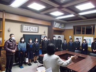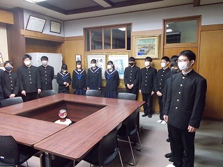 津島高校の剣道部練習場が改修工事のため、昨年末より、津島高校の剣道部が武道場を使って練習をしていました。さすが高校生です。礼儀正しく、見ていると応援したくなる練習風景でした。本日が最終日ということで、「使わせていただいた武道場をきれいに」と、使う前よりもきれいにしてくれました。新人戦団体、個人でよい成績を収めたとのことでした。佐屋中生も将来、仲間入りしてほしいと思いました。