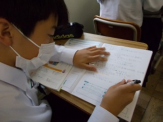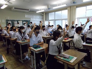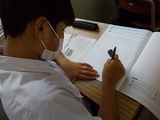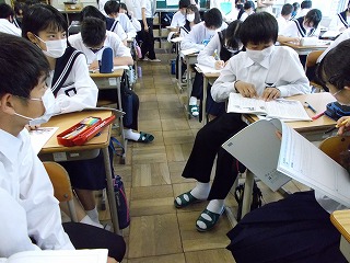 「なぜ、礼儀が大切なのでしょうか」と、先生が尋ねると「好印象を与えるから」「気持ちよく生活するため」などの返答がありました。今日は、『礼儀』について考える道徳の授業でした。自分の考えをまとめると、まわりの人たちに意見を伝え、まわりの人の意見を聴いて、さらに考えていきます。授業の終わりには「人だけでなく、モノにも気持ちを込めてあいさつしていこうと思います」と、発言する生徒もいました。